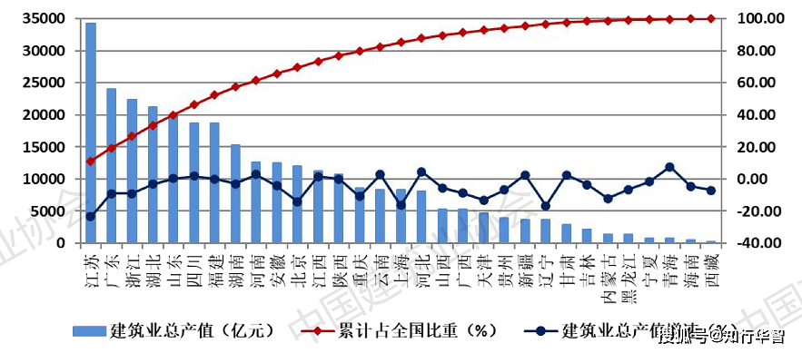 (一)江蘇建筑業總產值以絕對優勢領跑全國,廣東、浙江、湖北分列第二、三、四位。21個地區建筑業總產值出現負增長。