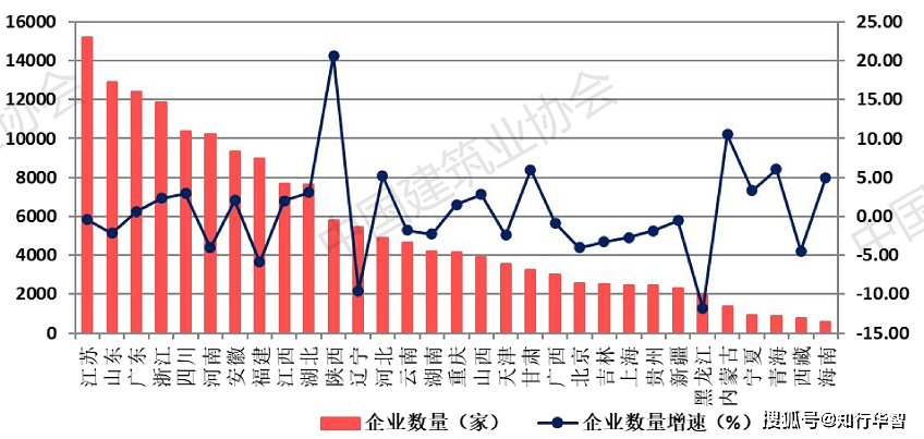 (六)2025年,江蘇、山東、廣、浙江、四川、河南6省建筑業企業數量均超過1萬家。15個地區企業數量出現增長,其中,陜西的增速超過20%,16個地區企業數量出現負增長。