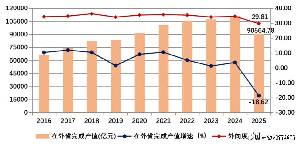 (四)2025年建筑業在外省完成產值打破近年來的連續增長,出現下降,比上年減少18.62%。