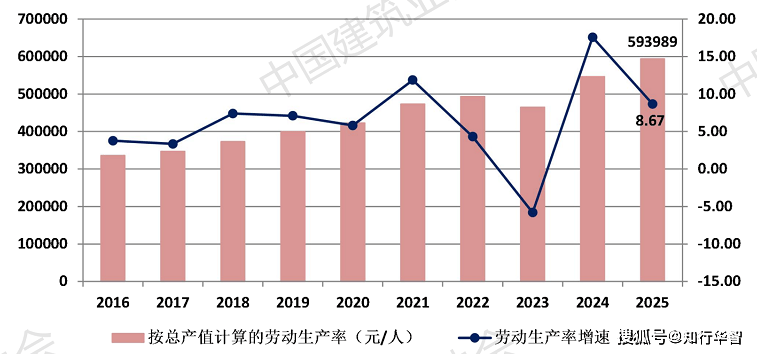 2016-2025 按建筑業總產值計算的建筑業勞動生產率及增速