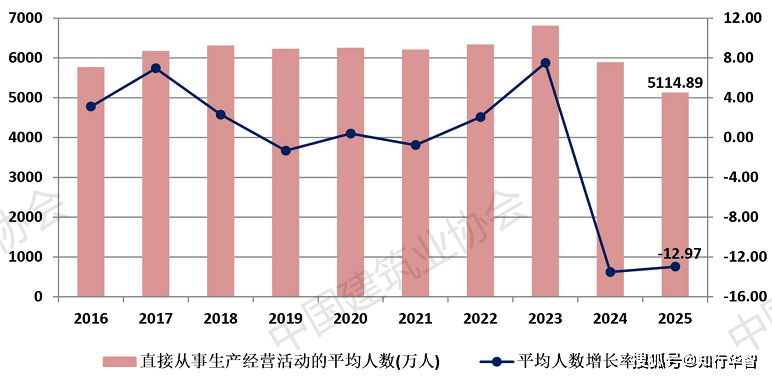 2016-2025 年建筑業直接從事生產經營活動的平均人數增長情況